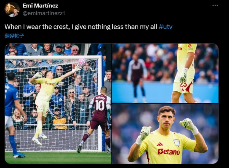 9月14日讯 在帮助维拉0-0客场战平埃弗顿后,大马丁更新了社交媒体。大马丁写道:“当我身上戴着这枚队徽时,我都全力以赴...