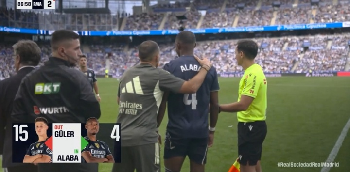 09月14日讯 西甲第4轮,10人作战的皇马2-1战胜皇家社会。在比赛伤停补时阶段,皇马用阿拉巴换下居勒尔,阿诺德、阿森...