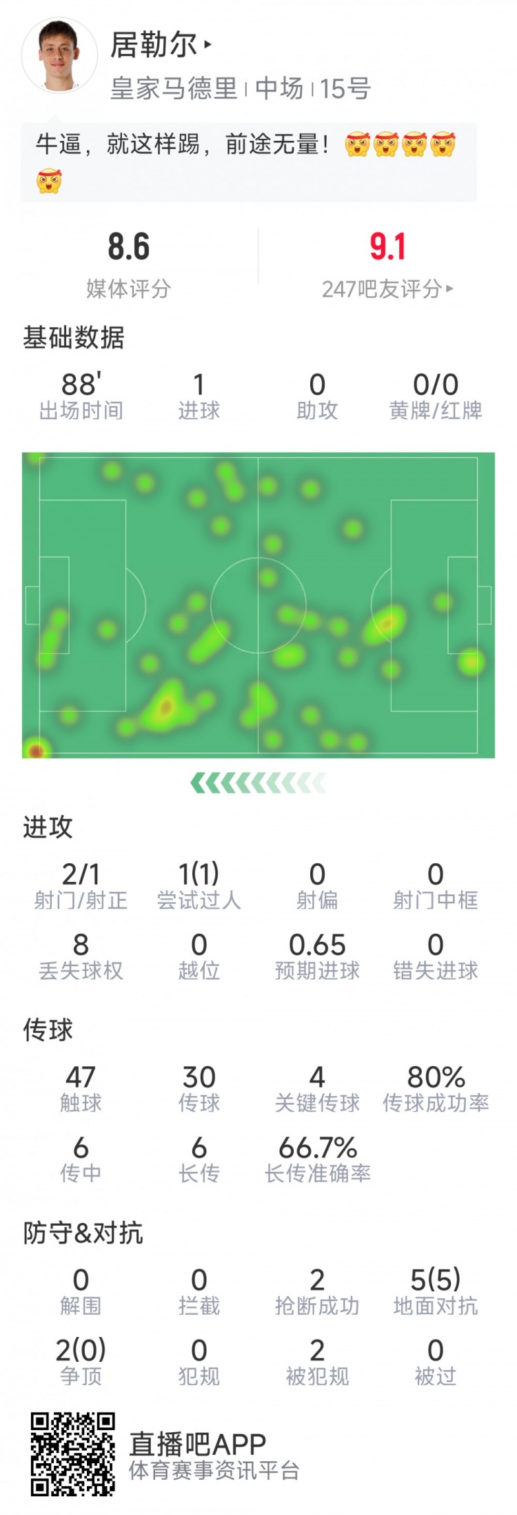 居勒尔本场数据:1粒进球,2射1正,4次关键传球,2次抢断