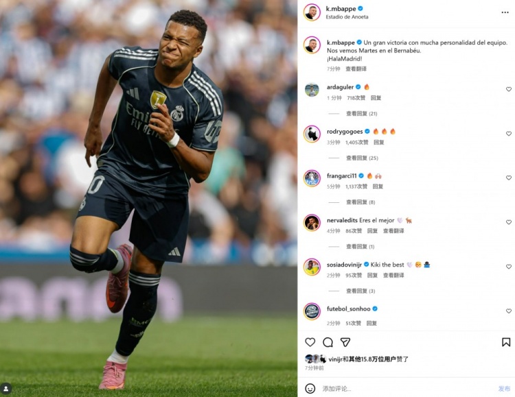 9月14日讯 在本轮西甲,皇马2-1击败皇家社会。本场比赛姆巴佩传射建功,赛后他也在社媒晒照庆祝,写道:“球队通过意志品...