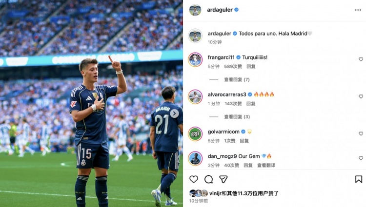 9月14日讯 皇马2-1击败皇家社会,赛后本场比赛打进一球的居勒尔更新社交媒体庆祝胜利。居勒尔:一起为了同一个目标,Ha...