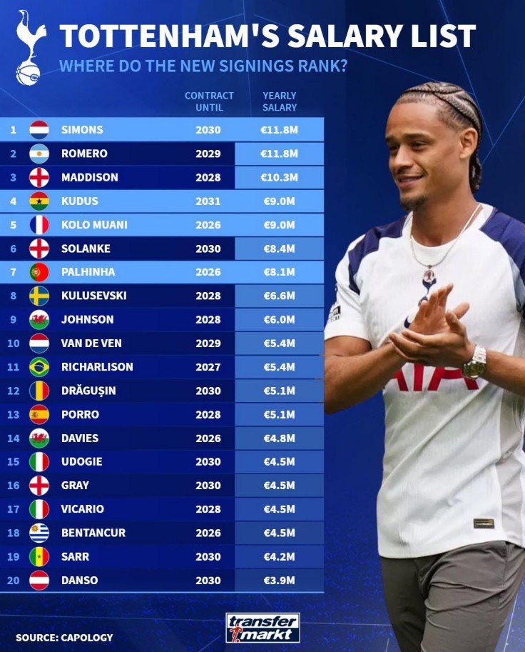 德转盘点热刺队内薪资榜:哈维-西蒙斯、罗梅罗最高,麦迪逊第三