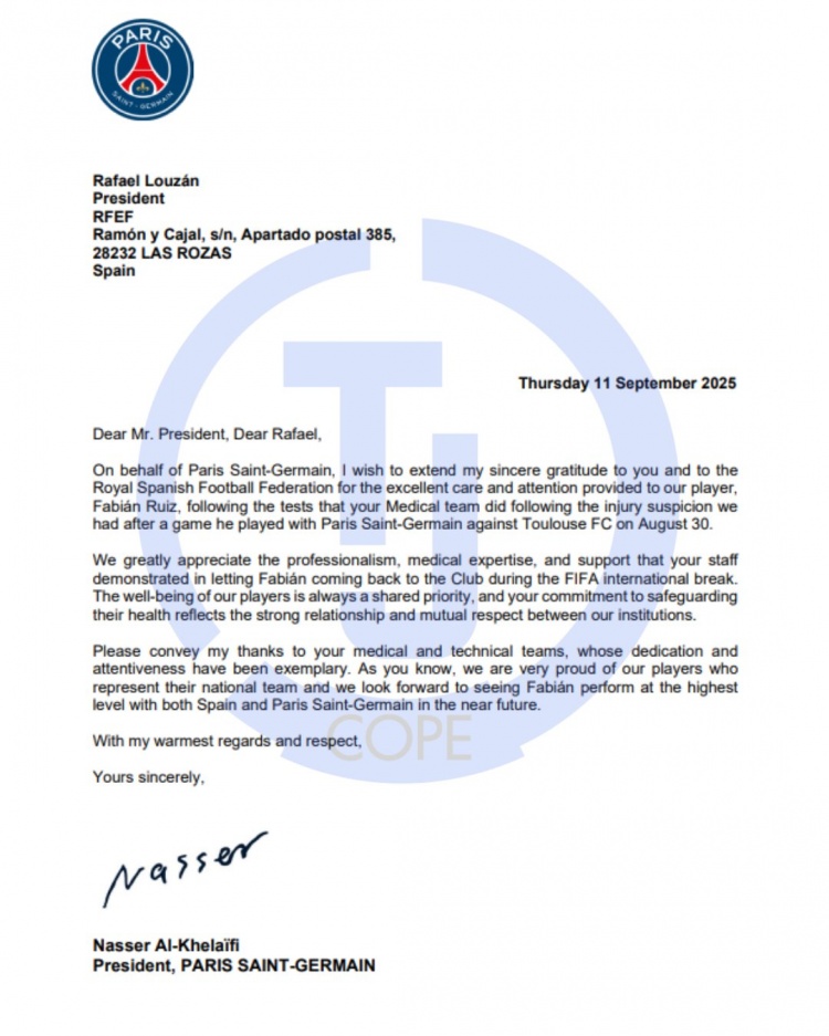 9月13日讯 巴黎主席纳赛尔致信西足协主席,感谢西班牙国家队放法比安-鲁伊斯提前归队。信中写道:“尊敬的主席先生,亲爱的...