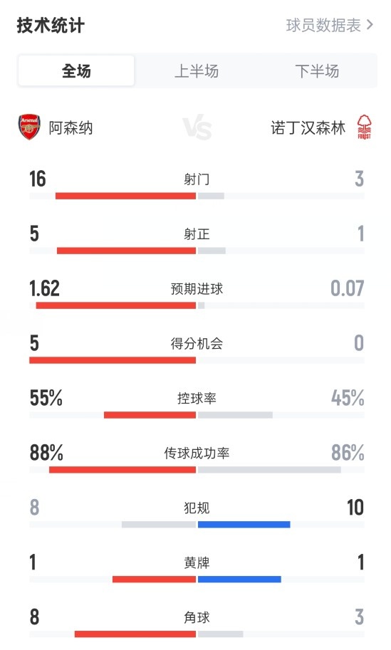 全面占优!阿森纳3-0森林数据:射门16-3,射正5-1,控球55%-45%