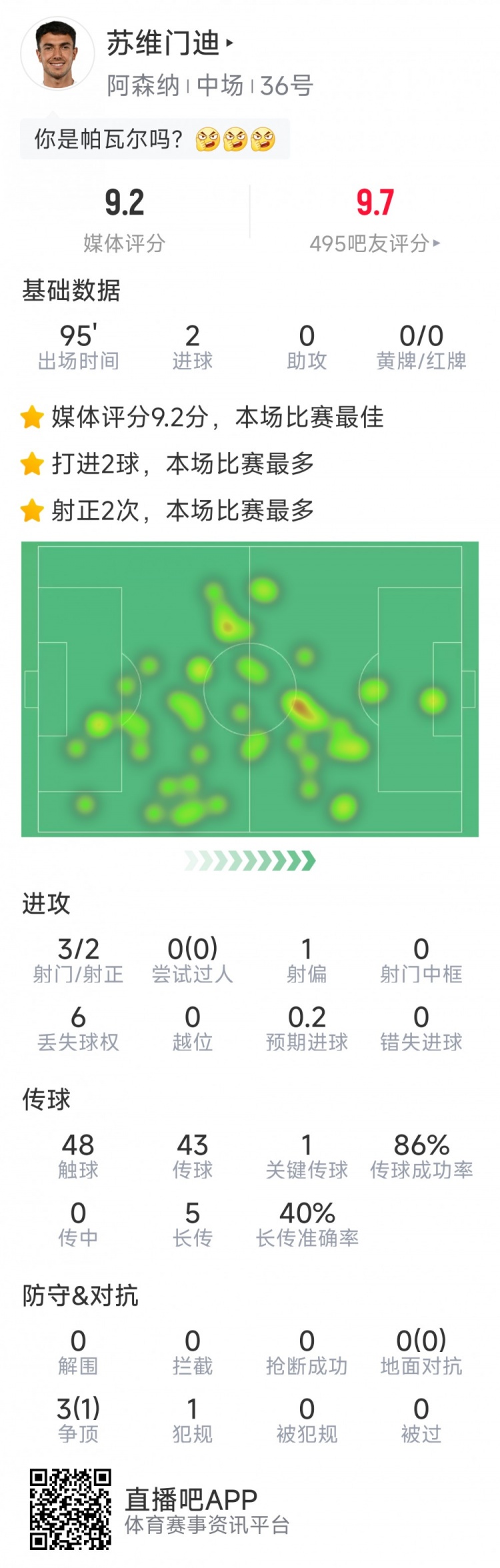 苏维门迪本场数据:梅开二度,3射2正,1次关键传球,评分9.2分