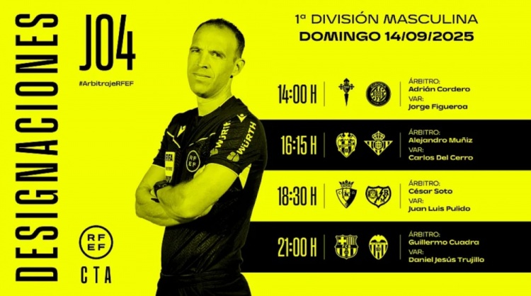 9月13日讯 当地时间周日(9月14日)进行的西甲第4轮四场比赛裁判已经确定,具体任命如下:9月14日20:00 塞尔塔...