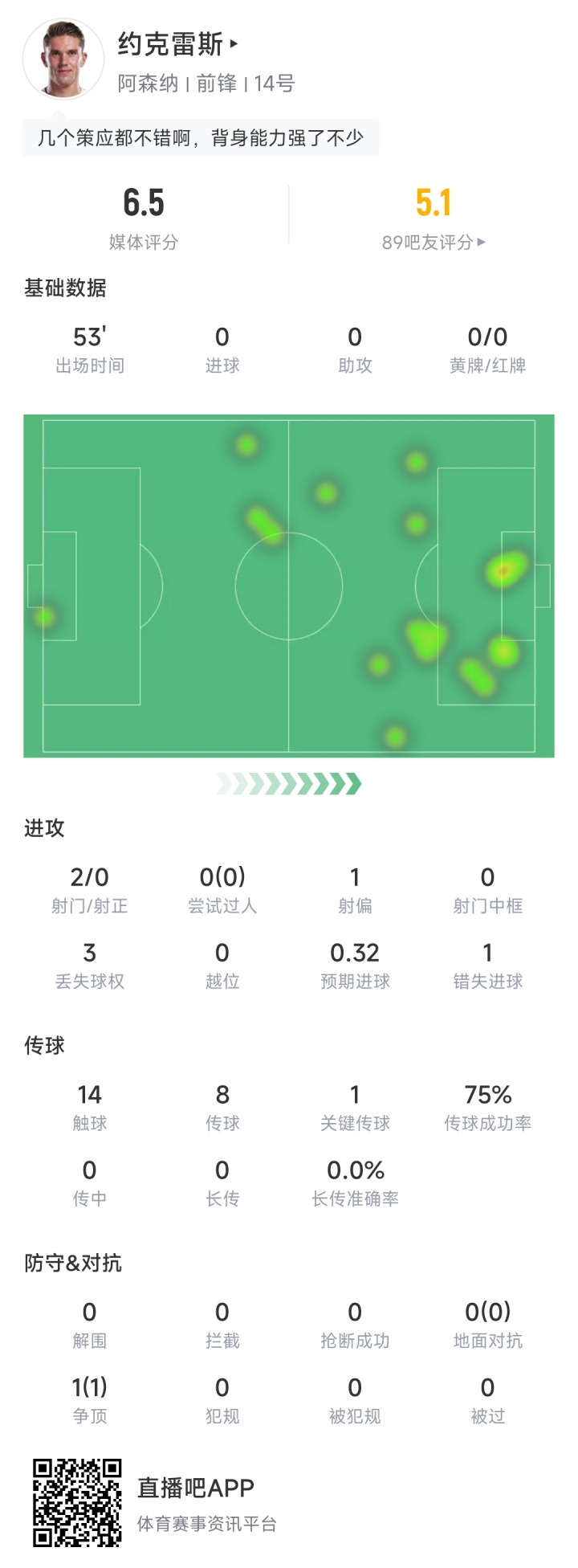 下半场爆发?约克雷斯半场2射门0射正 0过人0对抗成功14触球8传球