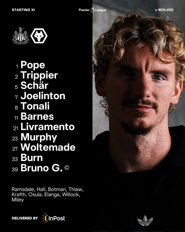沃尔特马德首秀!纽卡vs狼队首发:托纳利、吉马良斯、黄喜灿先发