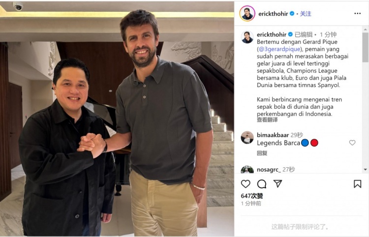 托希尔社媒晒与皮克合照:与冠军球员会面,讨论印尼足球的发展