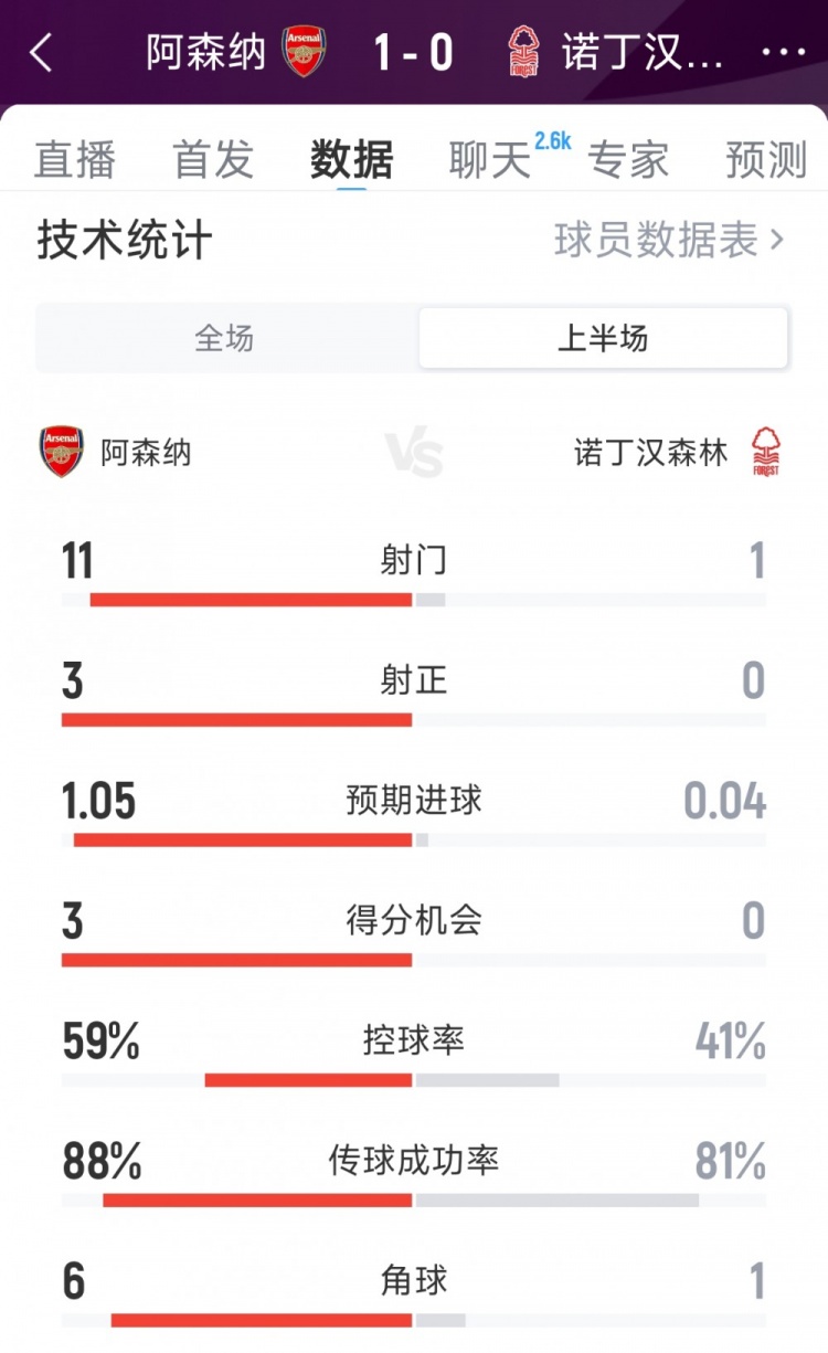 优势明显!阿森纳1-0诺丁汉森林半场数据:射门11-1,射正3-0