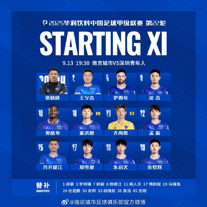 2025中甲联赛第22轮,南京城市VS深圳青年人 首发名单出炉