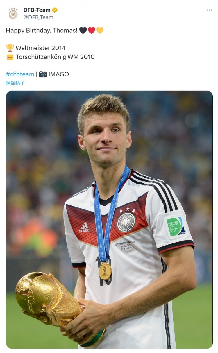德国队祝穆勒36岁生日快乐,为国家队出战131场进45球+问鼎世界杯