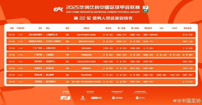 9月13日讯 中国足协官方公布中甲第22轮裁判人员安排,其中广西平果vs大连鲲城和青岛红狮vs佛山南狮两场比赛安排有VA...
