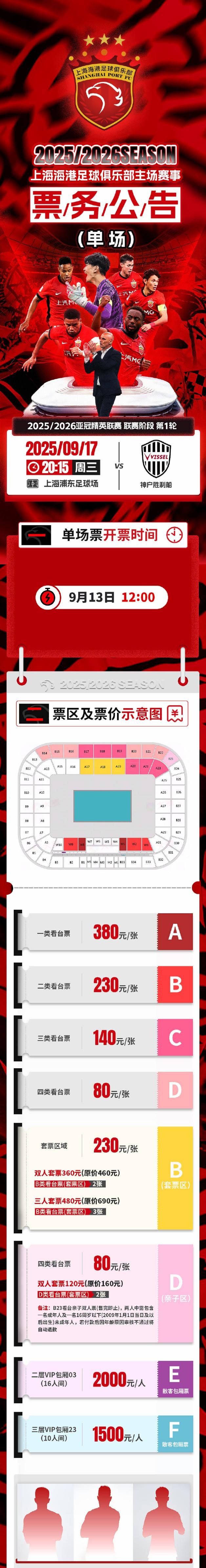 票务公告2025/2026亚冠精英联赛第1轮,上海海港vs神户胜利船的比赛将于9月13日12:00开票~...