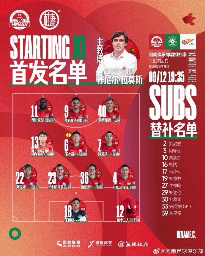 2025华润饮料中超联赛第24轮河南俱乐部酒祖杜康VS北京国安首发及替补队员名单📺CCTV-5+/央视体育客户端/央视频...