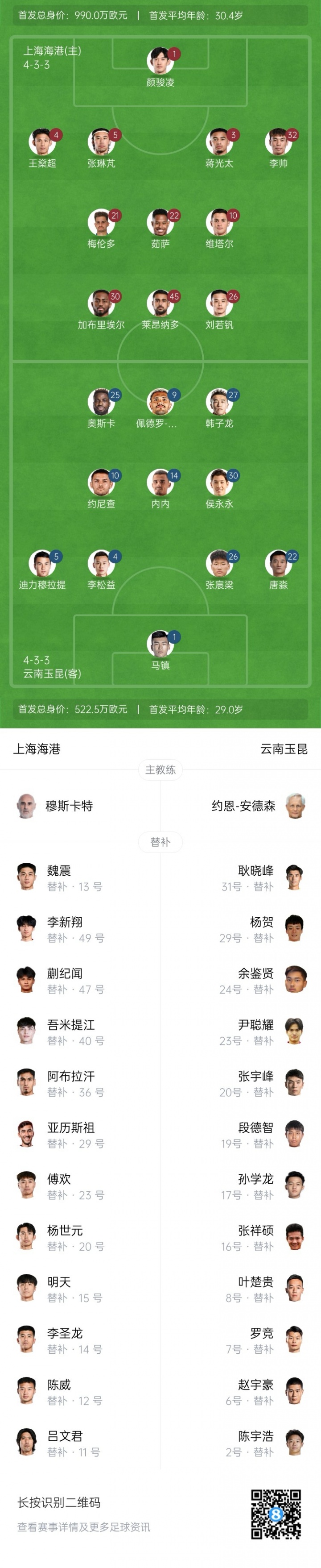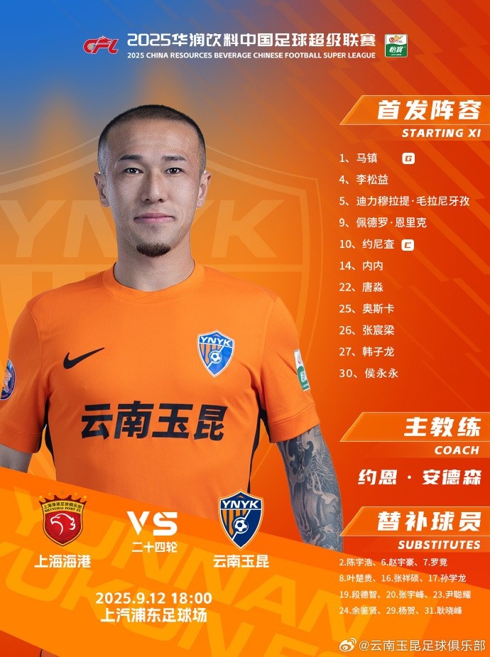 2025华润饮料中超联赛第24轮上海海港vs云南玉昆,今日首发名单。...