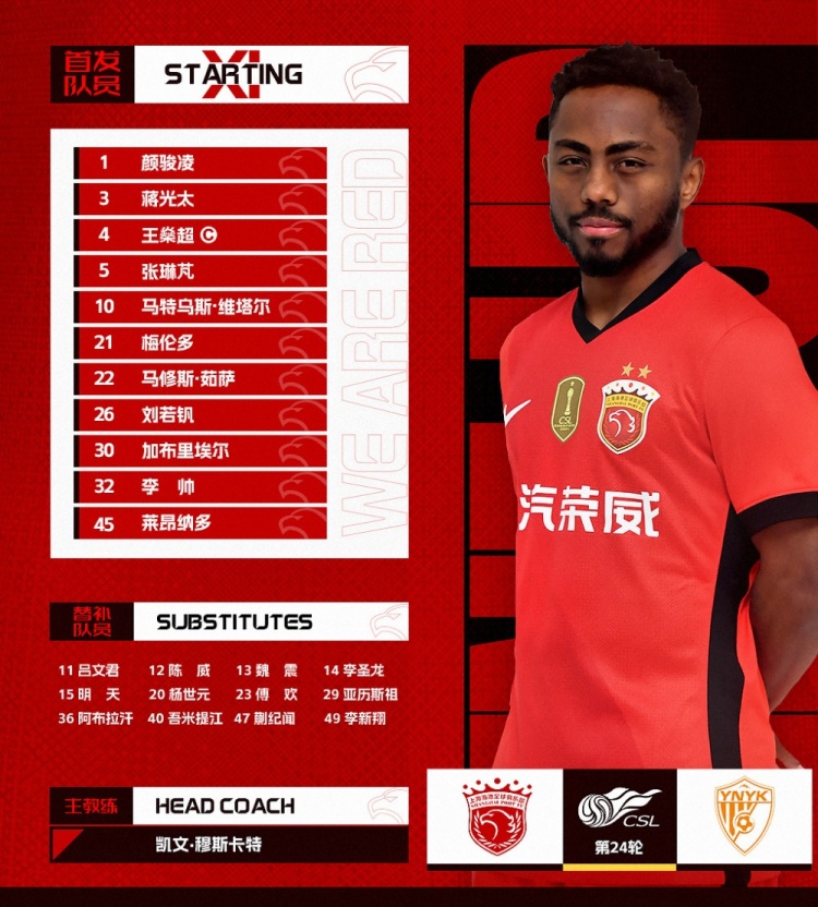 中超联赛第24轮上海海港vs云南玉昆,今日首发名单