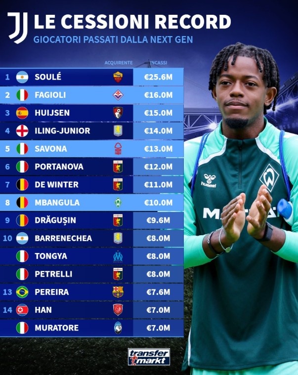 尤文青训卖人榜:苏莱2560万欧去罗马居首,法乔利第二赫伊森第三