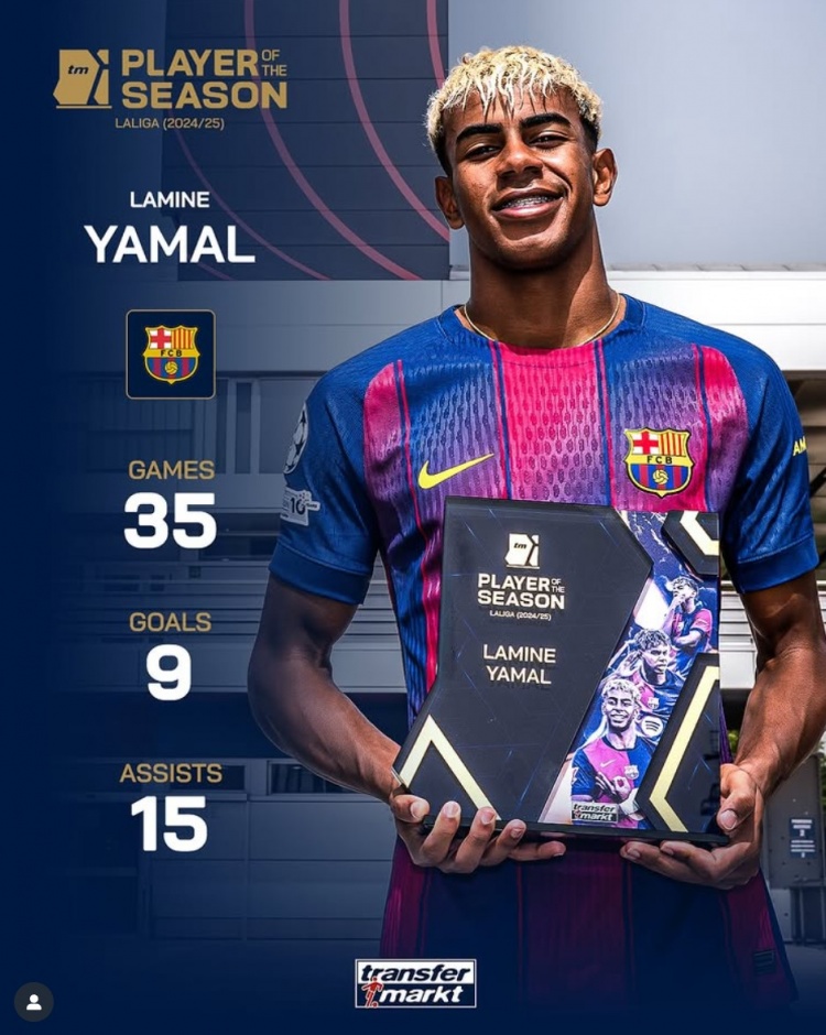 35场9球15助攻!德转官方:18岁巴萨边锋亚马尔获评上赛季西甲MVP