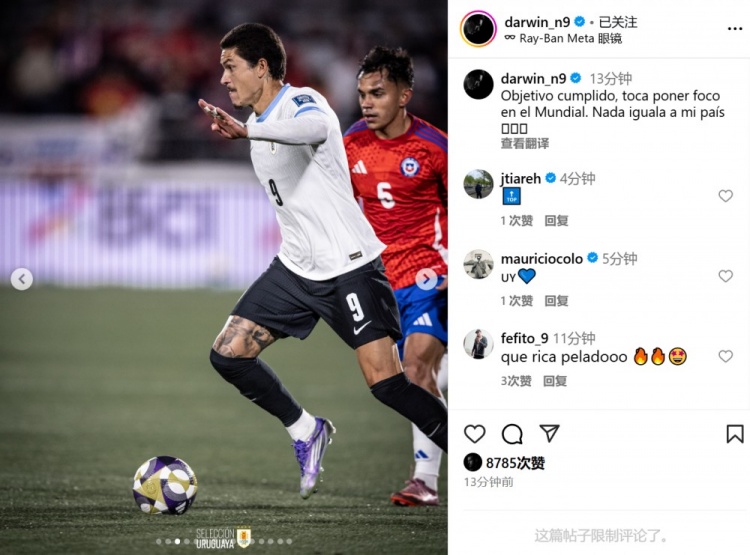 9月11日讯 世预赛南美区比赛,乌拉圭3-0秘鲁,乌拉圭0-0智利,确保获得2026年世界杯参赛资格。努涅斯在社媒写道:...