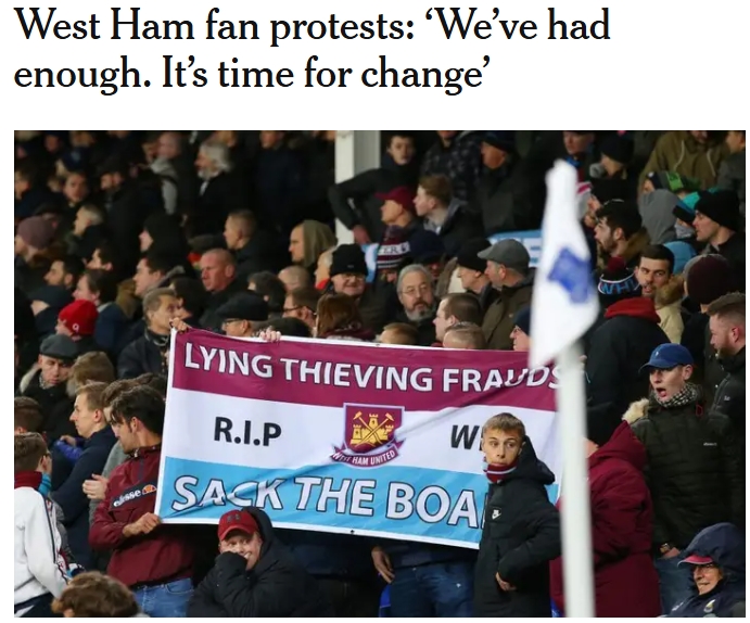 TA:西汉姆球迷计划在下周六对阵水晶宫比赛时,抗议球队董事会