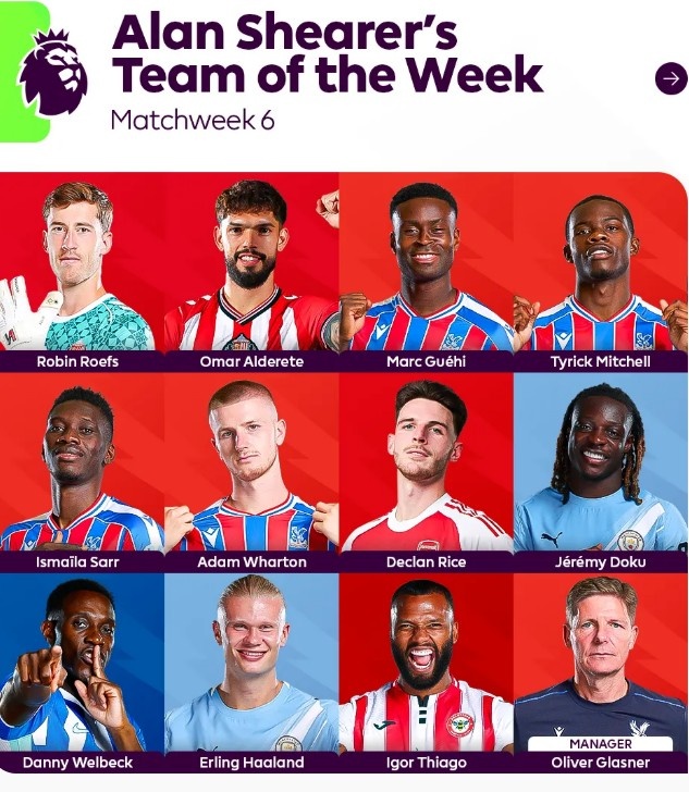 9月30日讯 英超第6轮战罢,名宿阿兰-希勒也评选出本轮最佳阵,其中 哈兰德、赖斯等在列,具体如下:门将:罗夫斯(桑德兰...