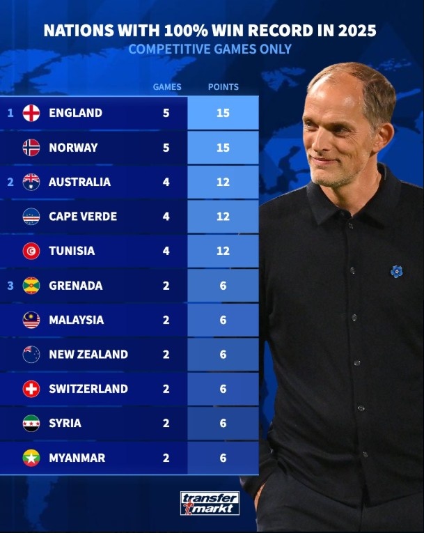 德转列今年正式比赛全胜的代表队:英格兰队、挪威队5战全胜