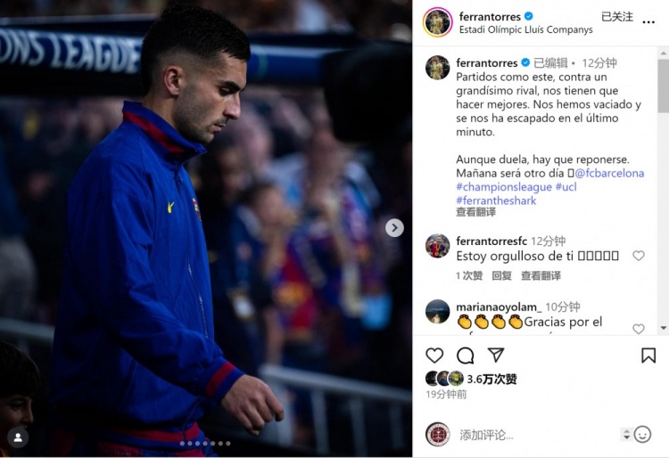 10月2日讯 欧冠联赛阶段第二轮比赛,费兰-托雷斯破门,但巴萨主场1-2不敌巴黎。费兰-托雷斯社媒写道:“像这样的比赛—...
