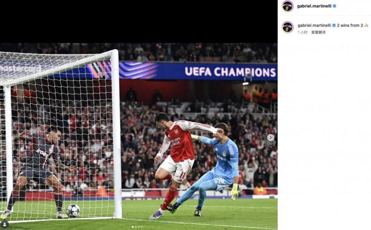 首开纪录!马丁内利社媒庆祝胜利:欧冠两战两胜🤙🏼