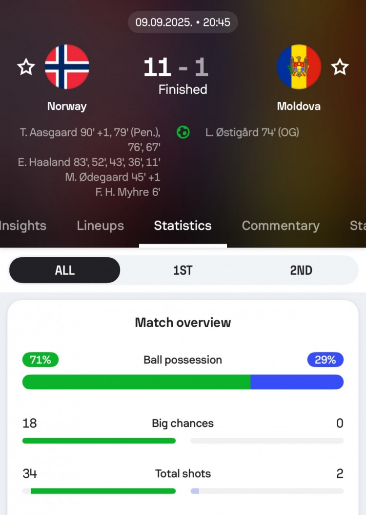 碾压!挪威10球大胜,sofascore数据库首次单场创造重大机会17+