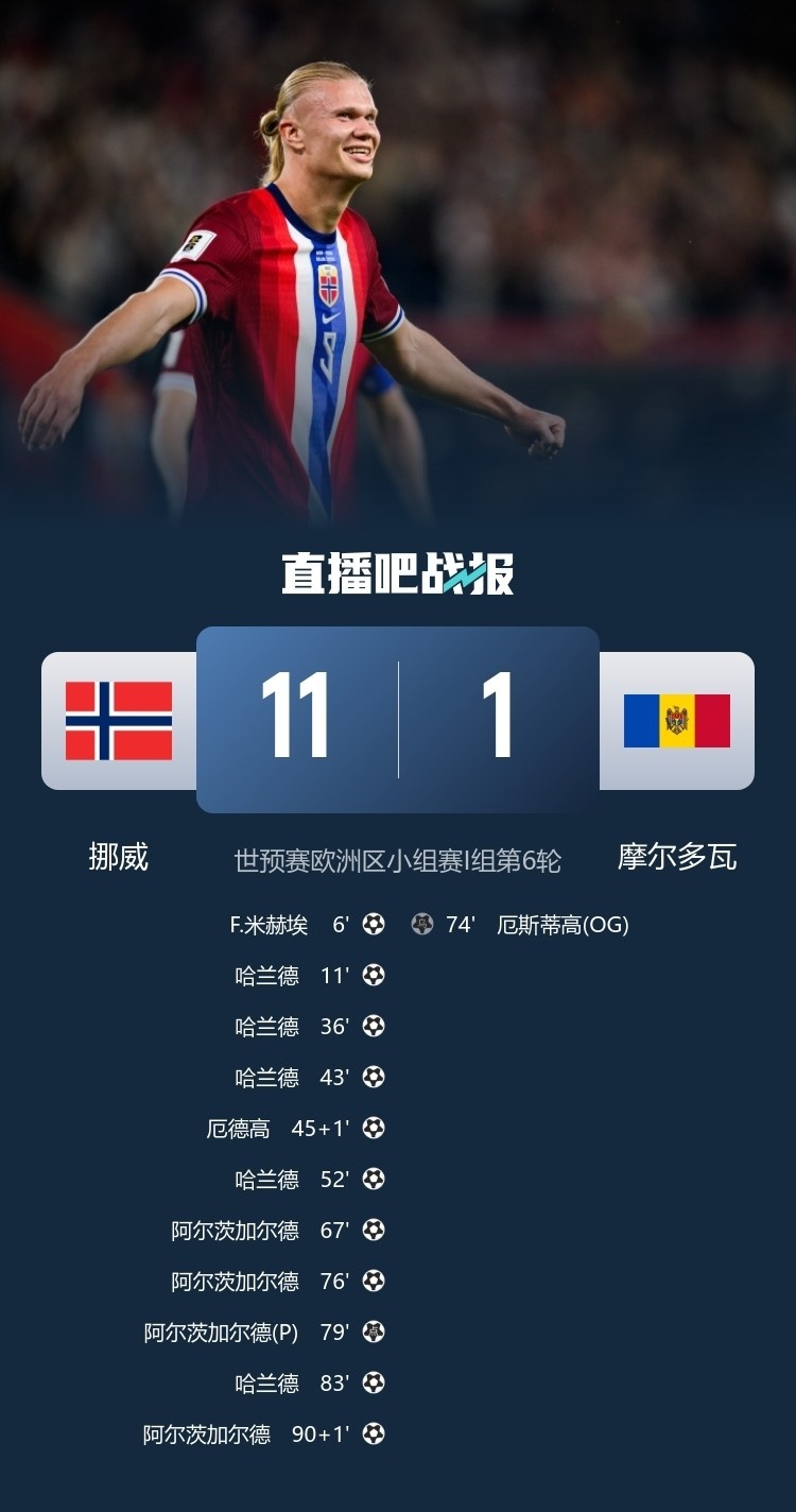 9月10日讯 世预赛欧洲区小组赛I组第6轮,挪威主场11-1狂胜摩尔多瓦,哈兰德贡献五子登科,阿尔茨加尔德上演大四喜。据...