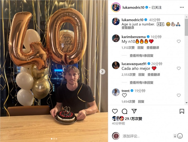 9月10日讯 莫德里奇更新社媒动态,晒出生日蛋糕。莫德里奇迎来40岁生日,他在社交媒体上晒出生日蛋糕,配文:“年龄只是一...