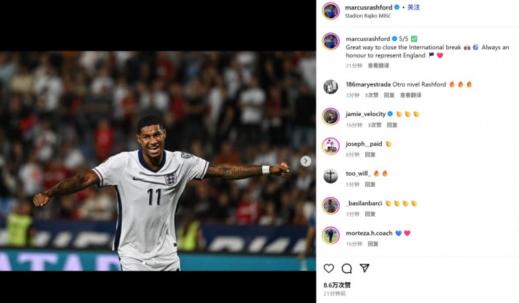 点射建功!拉什福德社媒纪念进球:很棒的方式结束此次国家队之旅