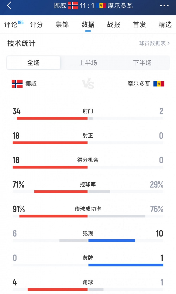 这把碾压局🤣挪威vs摩尔多瓦全场数据:射门34-2,得分机会18-0