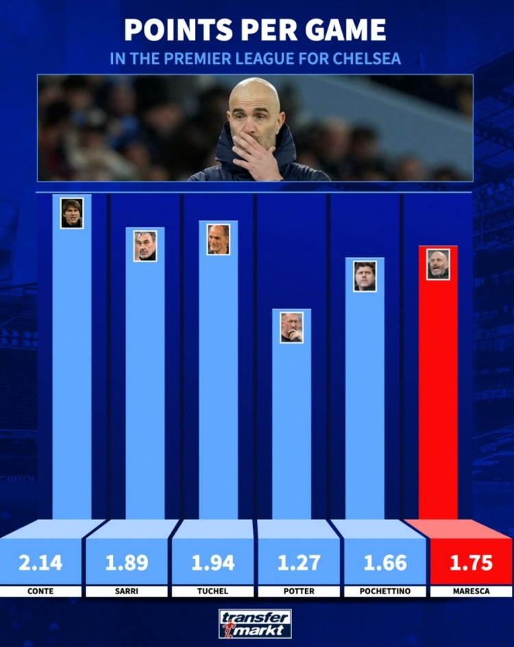 切尔西近6任主帅英超场均积分:孔蒂最高,马雷斯卡1.75分第四