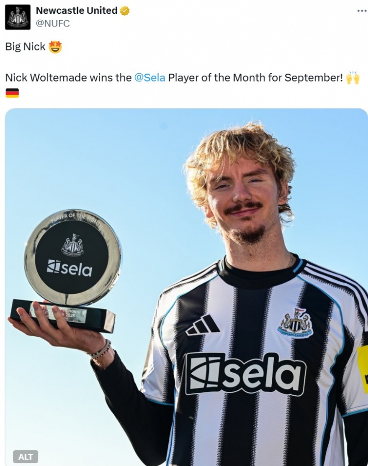5场2球,纽卡官方:新援沃尔特马德当选队内9月最佳球员