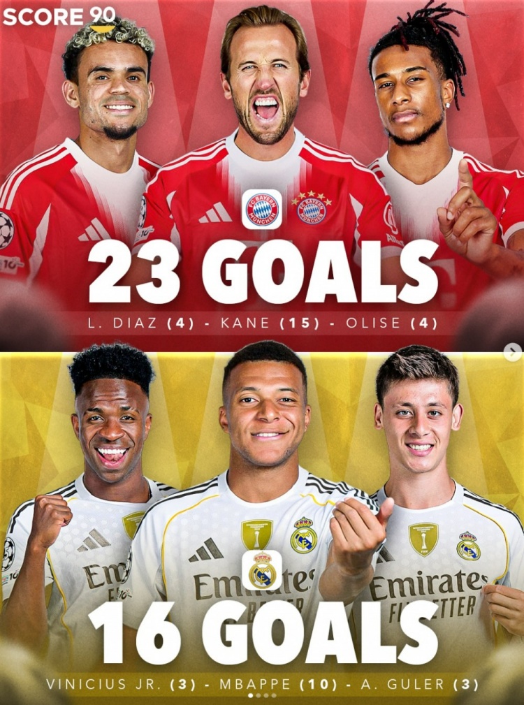 本赛季五大联赛进球最多三人组:拜仁3将23球居首,皇马16球次席