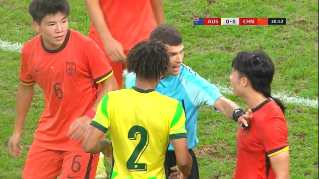 09月09日讯 U23亚洲杯预选赛第3轮,澳大利亚U23vs中国U22。比赛第31分钟,澳大利亚球员基利-亚当森在明知球...