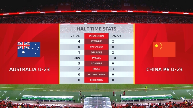 09月09日讯 U23亚洲杯预选赛D组第3轮,澳大利亚U23半场0-0中国U22,半场数据统计如图所示。控球率:73.5...