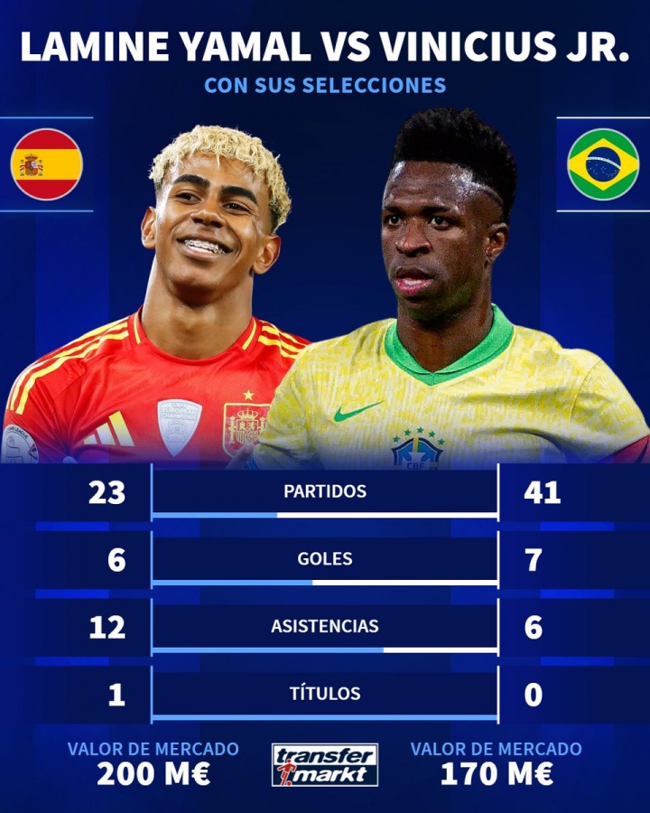 国家队数据对比:亚马尔23场6球12助1冠 维尼修斯41场7球6助0冠