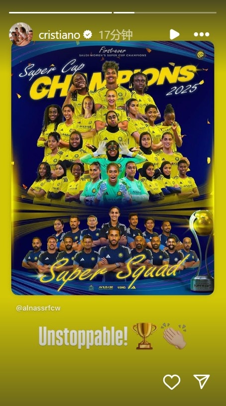 9月9日讯 C罗更新社媒,祝贺利雅得胜利女足夺得沙特女子超级杯冠军。2025年沙特女子超级杯决赛结束争夺,利雅得胜利女足...