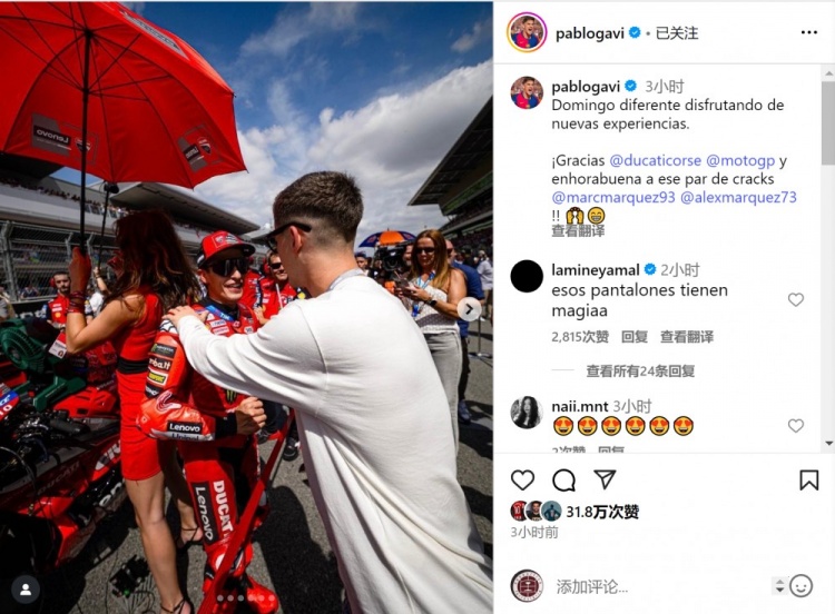 加维现场观战MotoGp比赛,社媒晒照:全新的体验