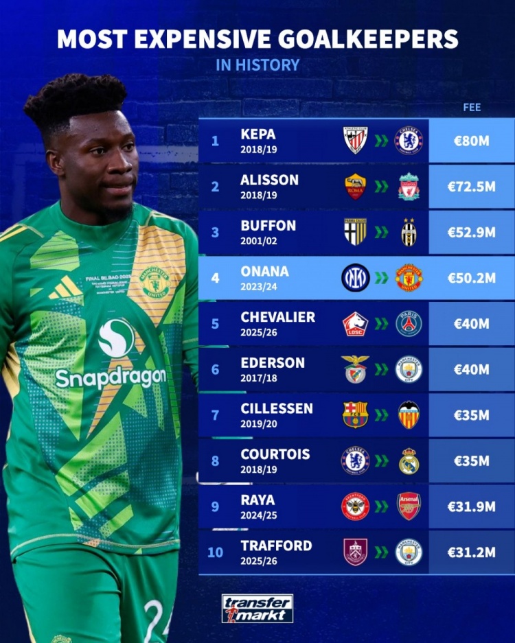 门将转会费排名:凯帕8000万欧居首,阿利森、布冯、奥纳纳前四