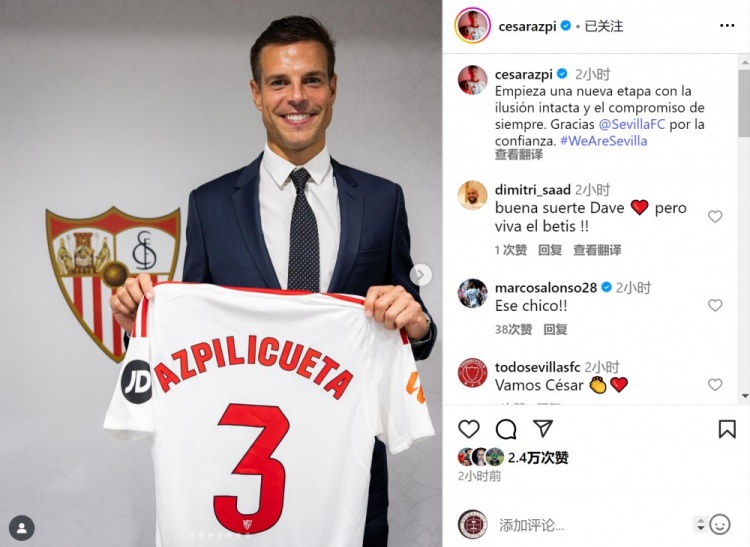 9月9日讯 阿斯皮利奎塔更新社媒动态,晒出展示塞维利亚球衣的照片。阿斯皮利奎塔自由身加盟塞维利亚,他在社交媒体上晒出展示...