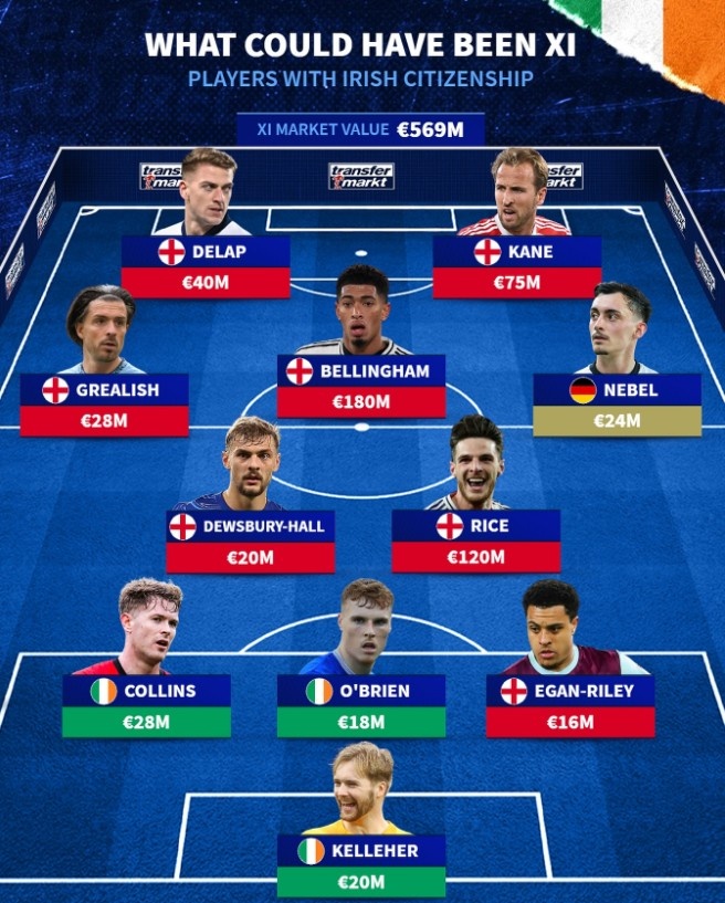 德转爱尔兰血统球员最佳阵:凯恩领衔,赖斯、贝林厄姆在列