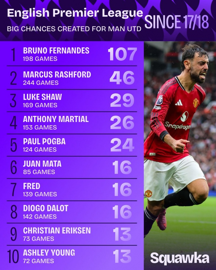 107次!自17/18赛季之后,B费是曼联在英超创造绝佳机会最多的球员