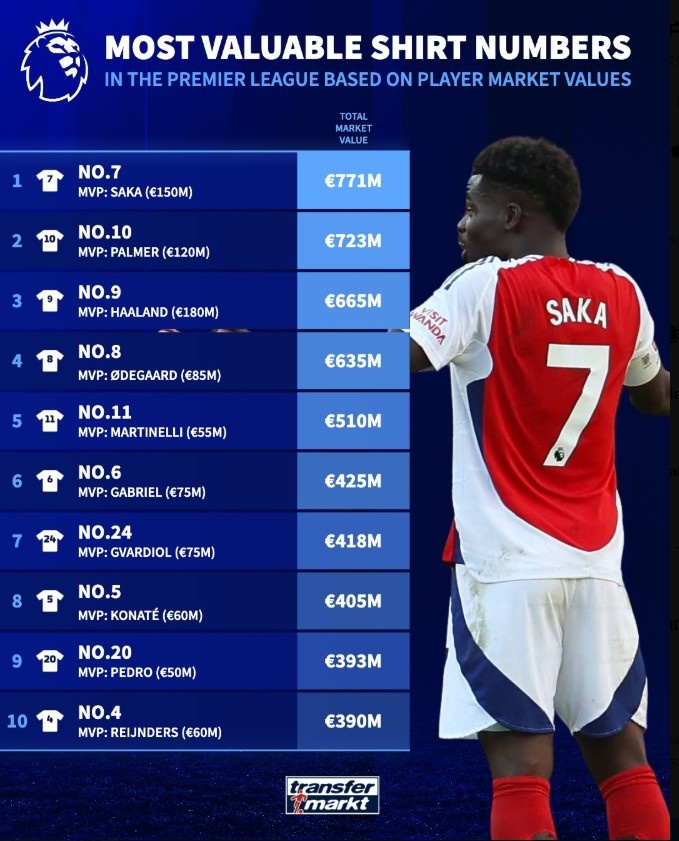 英超球衣号码身价排行:7号球员总身价7.71亿欧居首