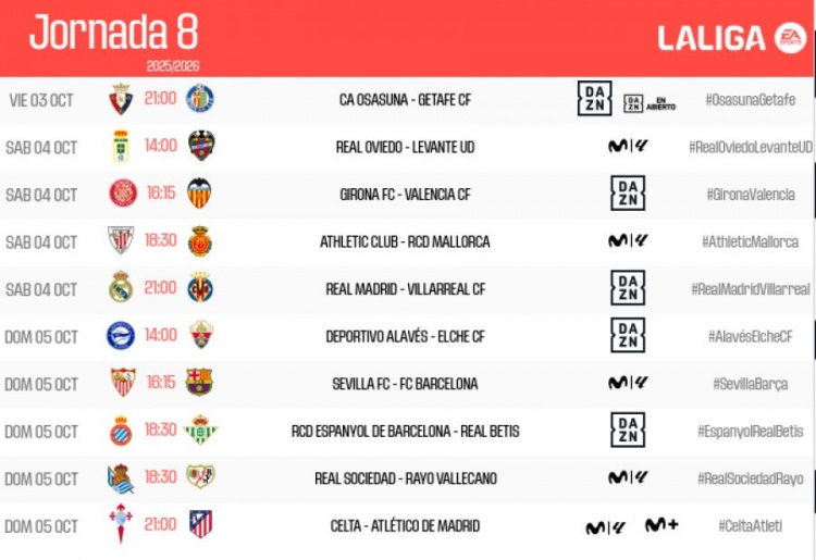 西甲官方公布联赛第8轮赛程:皇马主场迎黄潜,巴萨客战塞维利亚