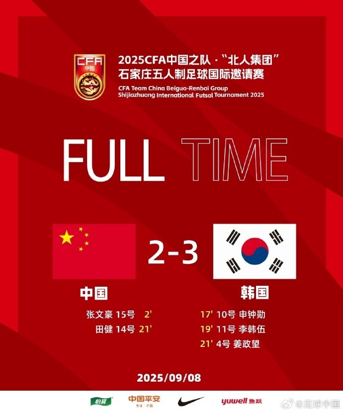 2025CFA中国之队·“北人集团”石家庄五人制足球国际邀请赛再战一场,中国队2比3负于韩国队。 ​​​...