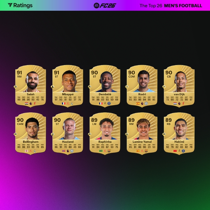 FC26官方评分:萨拉赫、姆巴佩91分最高,登贝莱90分、亚马尔89分